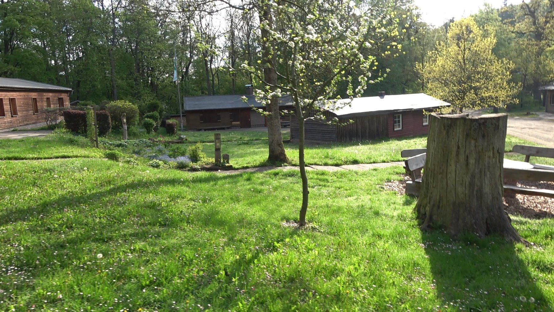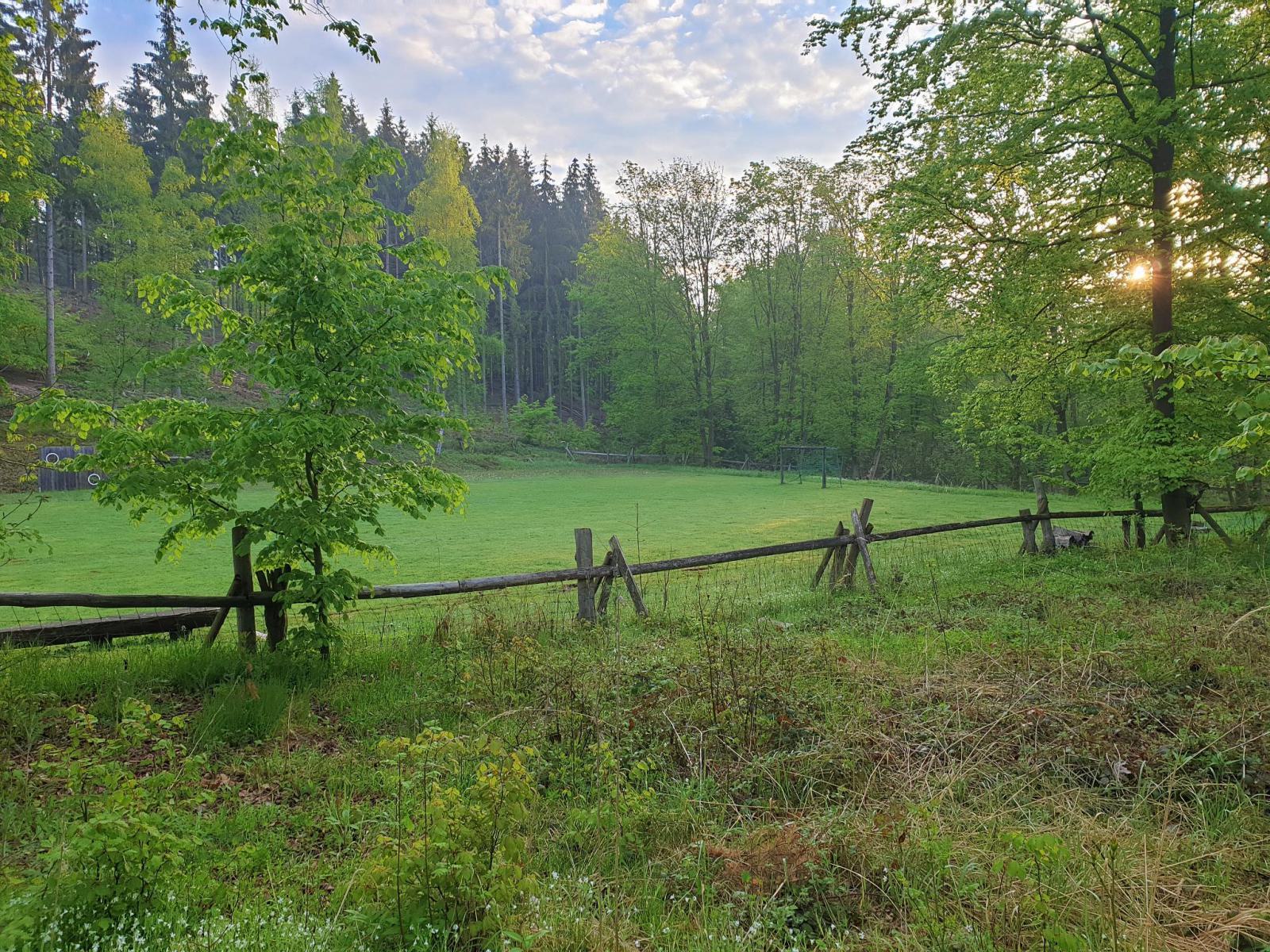 Am Bolzplatz unterhalb des Waldpädagogikzentrums verläßt man schließlich den Wald wieder und geht bis zum Waldpädagogikzentrum die letzten Meter wieder auf der breiten Zuwegung.